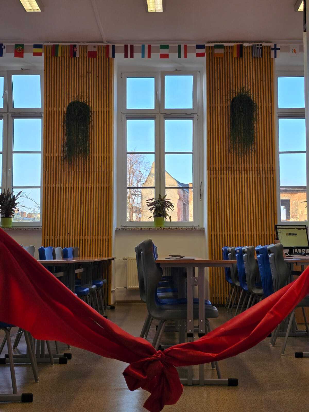 Nowo otwarta sala to nowoczesna i funkcjonalna przestrzeń dydaktyczna, przygotowana z myślą o współczesnych potrzebach uczniów. Została wyposażona w tablicę multimedialną, zestaw tabletów z mobilną szafą ładującą, nowe meble oraz energooszczędne oświetlenie LED. Całość dopełnia estetyczna, wielkoformatowa fototapeta, która nadaje wnętrzu wyjątkowy charakter.