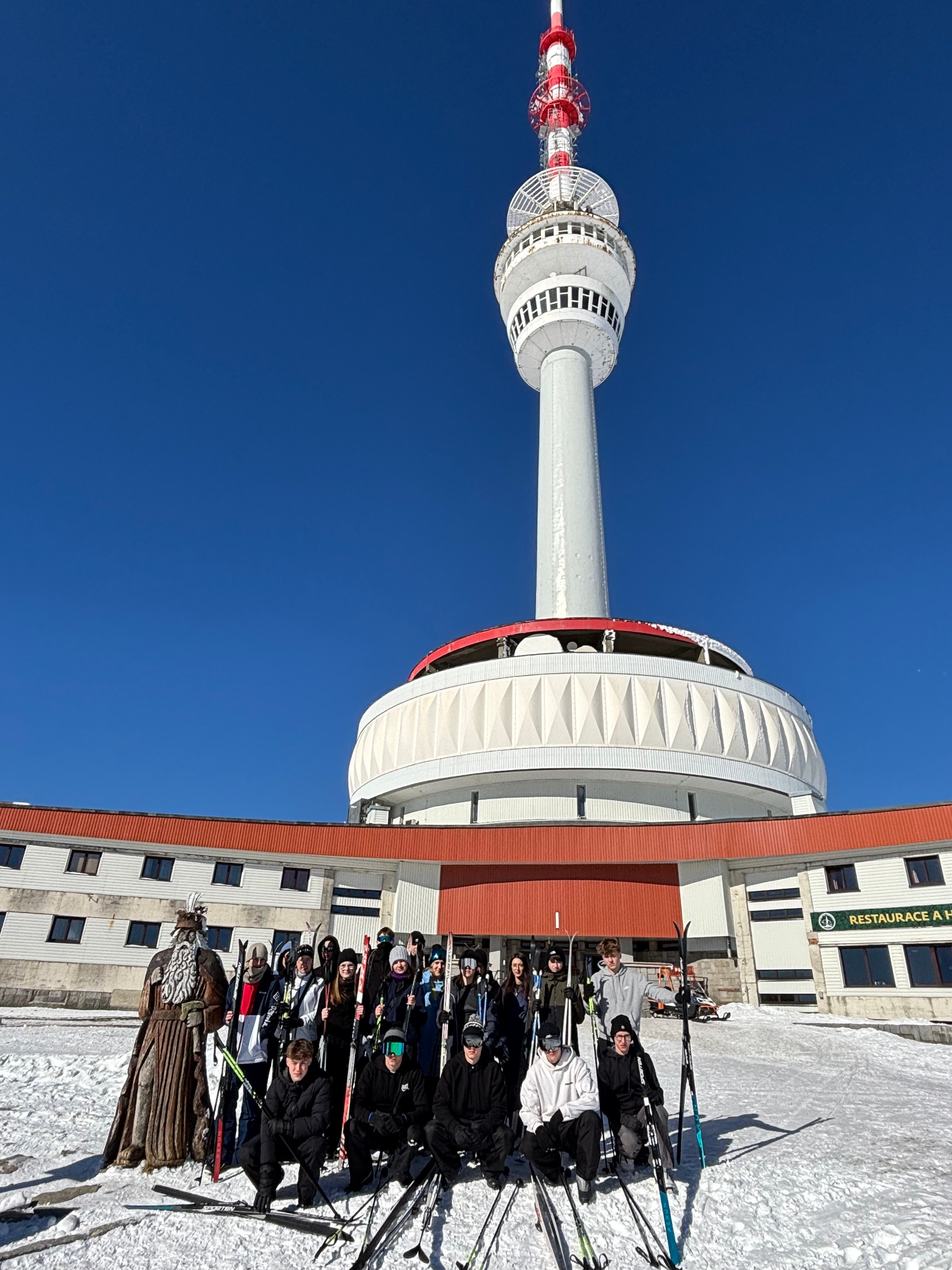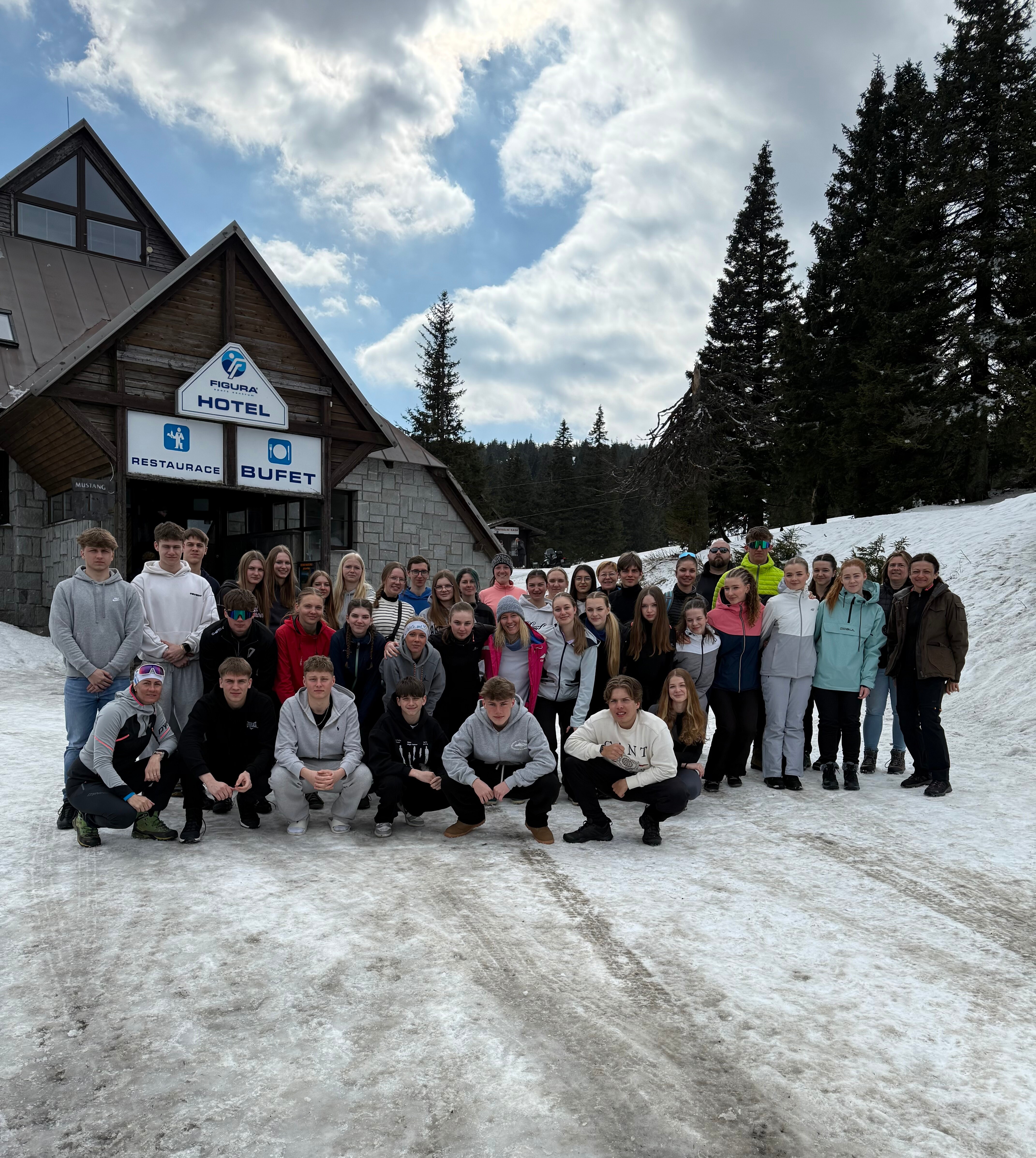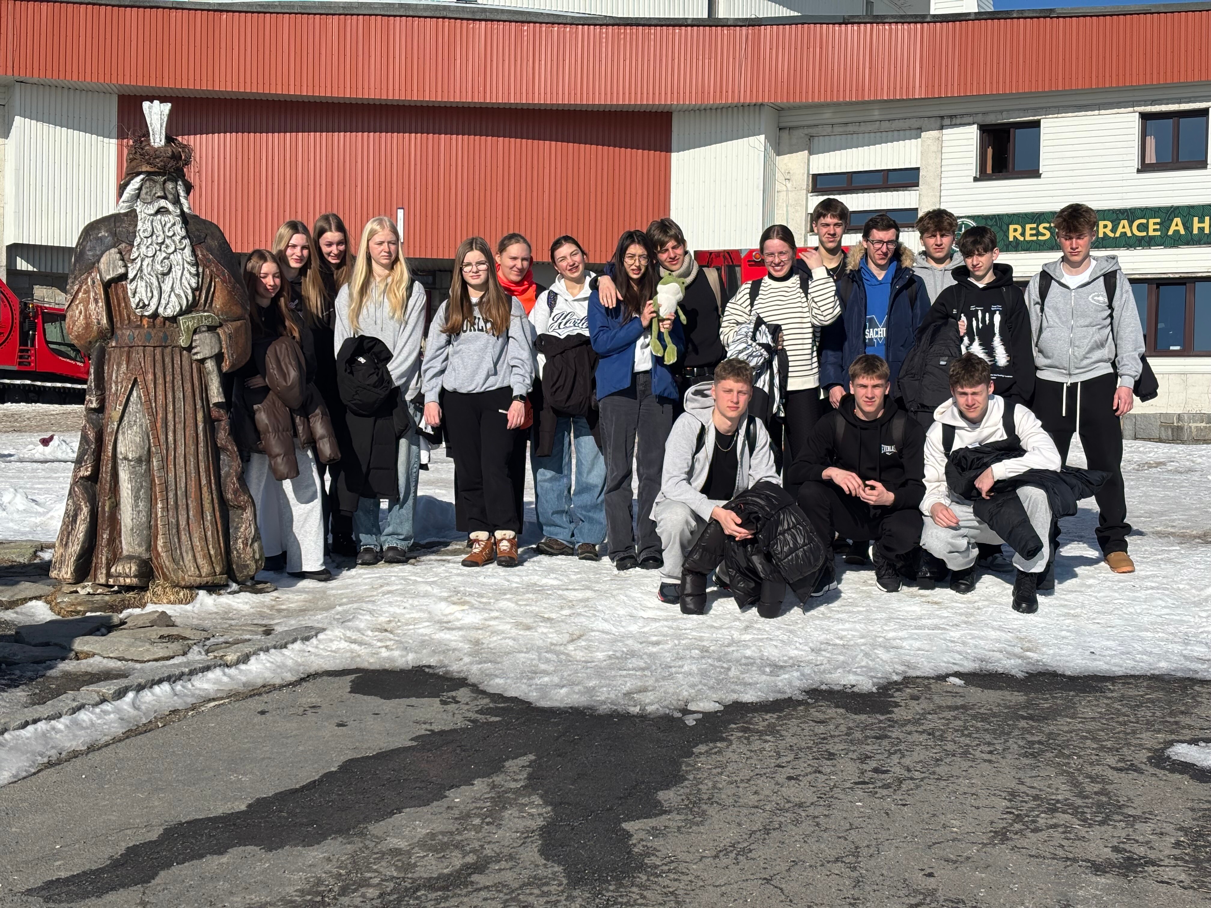 Pierwszego dnia pogoda nie rozpieściła młodych adeptów narciarstwa. Od rana panowały trudne warunki pogodowe z silnym wiatrem i opadami śniegu. Nie przeszkodziło to jednak w dobrej zabawie, gdyż po dotarciu i rozpakowaniu się w hotelu znajdującym się na samym szczycie góry, uczniowie z Czech i Polski wspólnie grali w gry towarzyskie i integracyjne. Wieczorem odbyło się również niezbędne podczas tego typu wyjazdów szkolenie z zasad bezpieczeństwa na stoku i nie tylko.