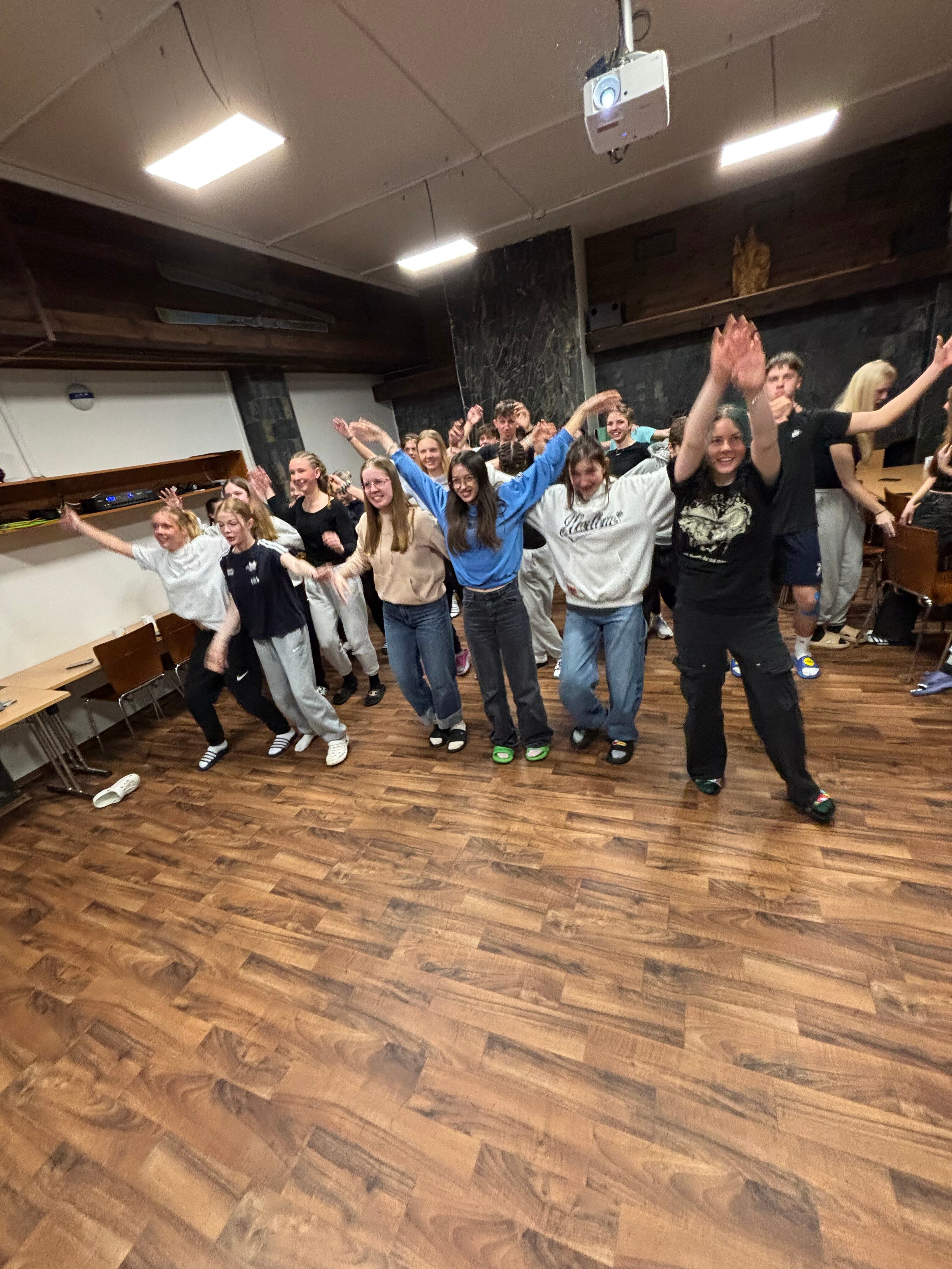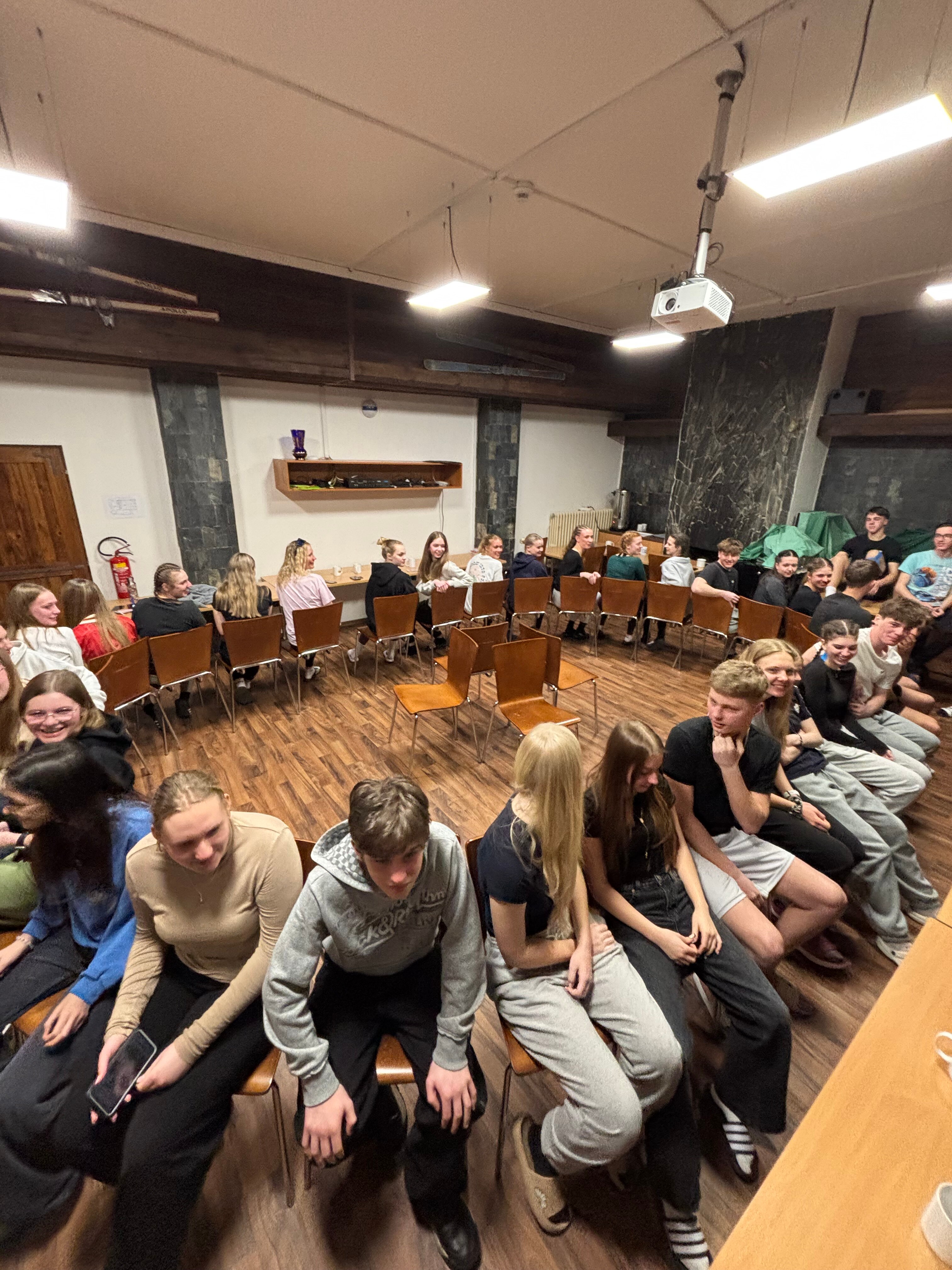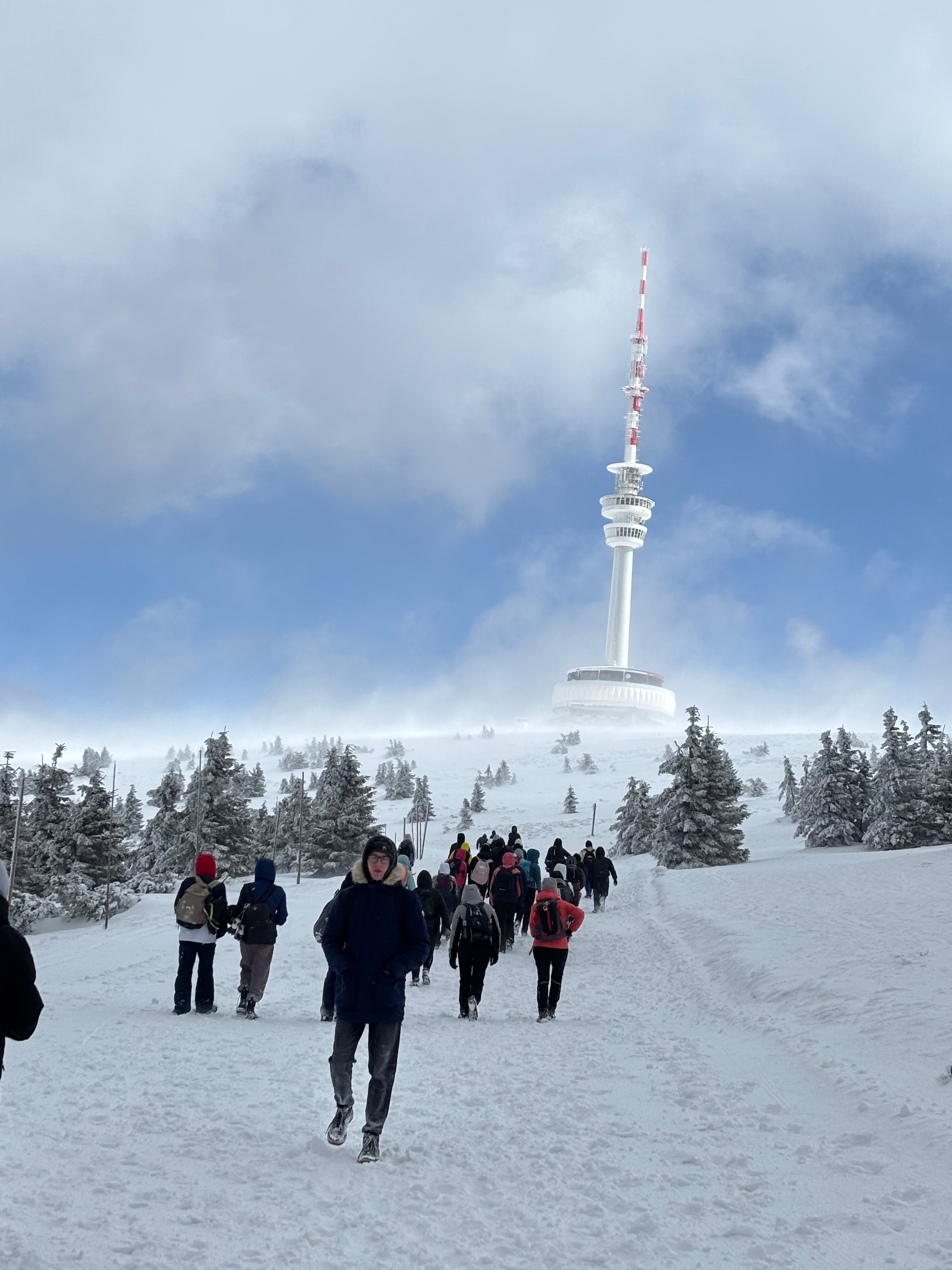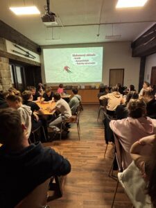 Pierwszego dnia pogoda nie rozpieściła młodych adeptów narciarstwa. Od rana panowały trudne warunki pogodowe z silnym wiatrem i opadami śniegu. Nie przeszkodziło to jednak w dobrej zabawie, gdyż po dotarciu i rozpakowaniu się w hotelu znajdującym się na samym szczycie góry, uczniowie z Czech i Polski wspólnie grali w gry towarzyskie i integracyjne. Wieczorem odbyło się również niezbędne podczas tego typu wyjazdów szkolenie z zasad bezpieczeństwa na stoku i nie tylko.